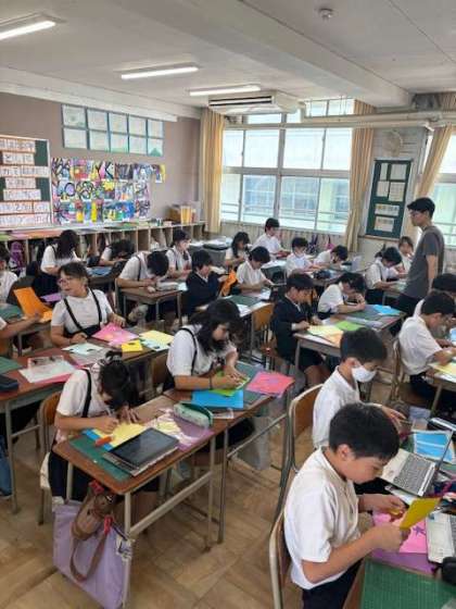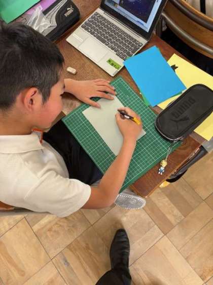 6年生の教室を訪れると、子どもたちはカッターを丁寧に使いながら、パソコンで調べた画像の模様と同じように、カラー画用紙を切っていました。切った模様はべつの画用紙に貼り、素敵な作品を作るそうです。出来上がりが楽しみですね。