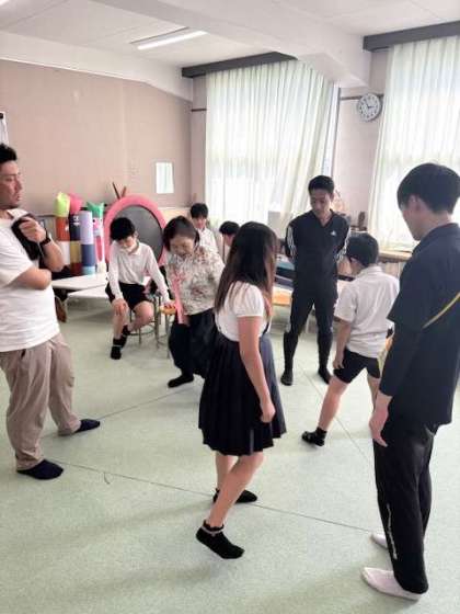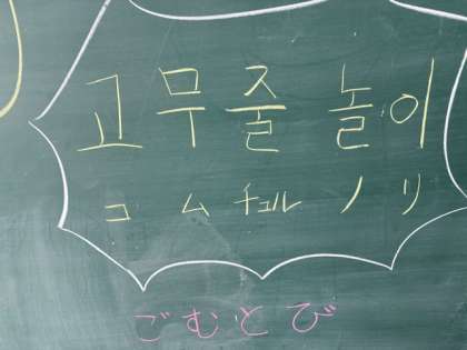 昨日のセッパラム活動では、韓国・朝鮮での遊び「コムチュルノリ」をしました。「コムチュルノリ」とは日本のゴム跳びと同じような遊びです。日本のゴム跳びと少し異なるのが、ゴムを三角形にして、足をゴムの上をまたいだり、ゴムを足でひっかけてひねったりします。少し複雑で最初は難しそうでしたが、楽しそうに遊んでいました。