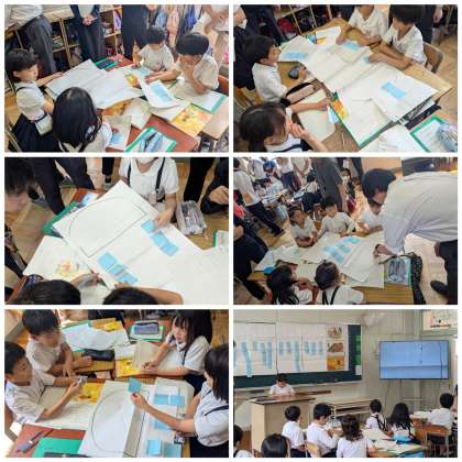 読み取ったことを共有し、意見交流する手立てとして思考ツールを活用することにチャレンジしました。2組の児童は、クラスの人数以上の先生に見守られながらも、しっかりと学習に取り組むことができました。おにの子どもはどんな人なのか、本文に即して一生懸命考え、意見をまとめることができました。