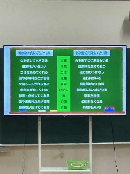 本日、税務署から講師の方をお招きし、税について学習しました。おそらく、子どもたちからすると身近な税といえば消費税ですね。払っている税があればどうなるのか?なければどうなるのか?の問題で、各項目で考えさせられました。やっぱり税金は大切だということが分かりました。