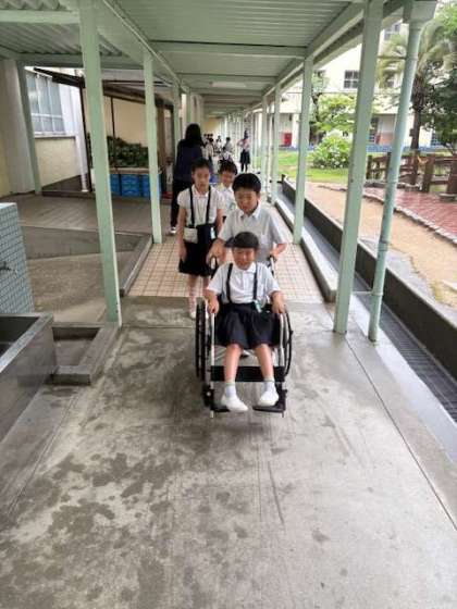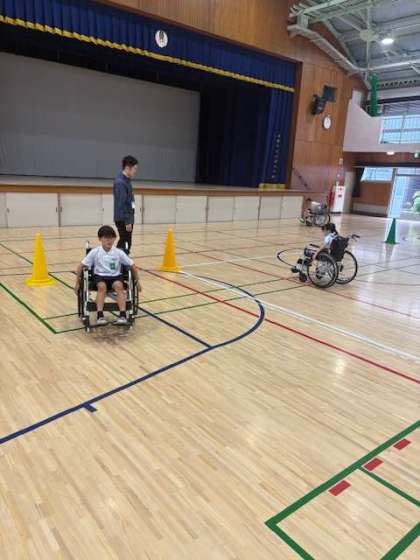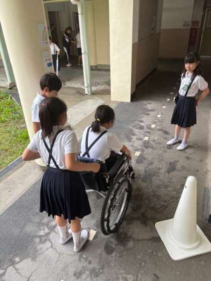 4年生は5時間目と6時間目に校舎や講堂を使い、車いす体験をしました。実際に車いすに乗り、どういった箇所を乗るのが難しいのかを知ったり、車いすを使っている人の気持ちを考えて押してあげる大切さを学習したりしました。