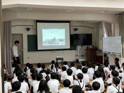 今日、5年生は平和学習として「沖縄戦」について学びました。美しい自然がいっぱいある沖縄で、日本で唯一の地上戦が行われたことや、ガマ(洞窟)の中であった悲しい出来事などを知りました。沖縄戦を体験した方の「戦争はもうないようにお願いします。」「一番戦争が怖い。なくしてほしい。」という思いをしっかり受け止めて、平和についてこれからも考えていきます。