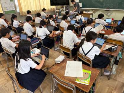 5年生の教室では一人一台端末を使って社会科の授業を行っていました。驚いたのは子ども一人ひとりのタイピングの速さです。普段からパソコンを使って調べ学習をしたり、タイピング練習をしたりしているので、慣れたものです。