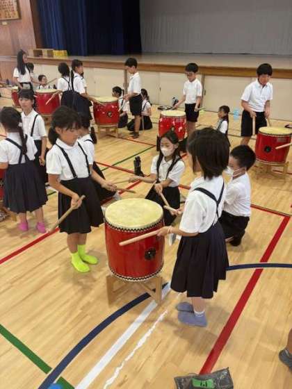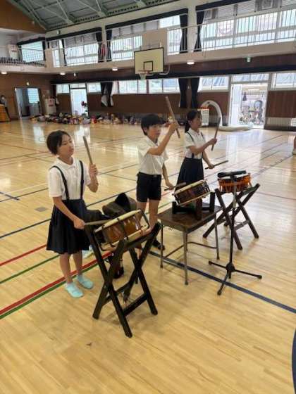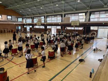 講堂から力強い太鼓の音が聞こえてきました。子どもたちは蒸し暑い中、集中して取り組んでいました。10月に予定している地域の祭りで発表する曲目を練習していました。春の時に比べ、力強さと団結力が増していました。今から祭りが待ち遠しいです。