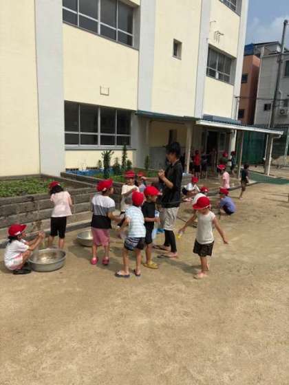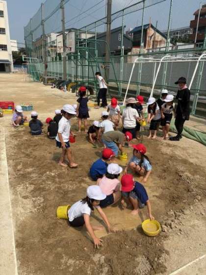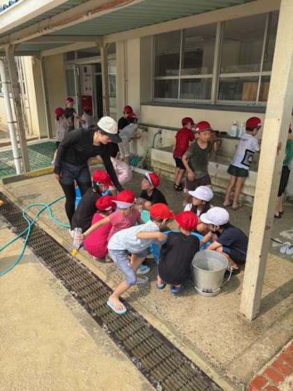 昨日、高殿小学校1年生恒例のどろんこ遊びがありました。子どもたちは濡れることや汚れることなど全く気にせず、心を開放して楽しそうに遊んでいました。先生に水をかけたり、友だちと泥を触ったり。こういう経験がすごく大切だなと感じる時間でした。