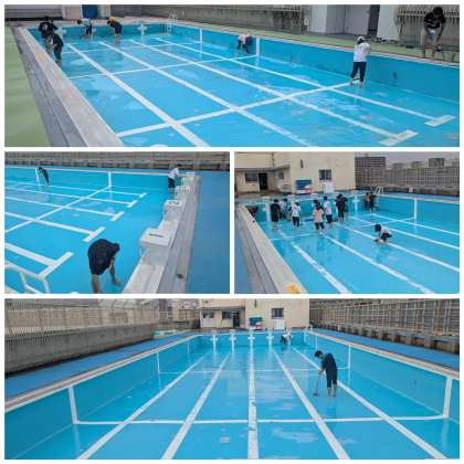 先生たちでプールの水の入れ替えと掃除を行いました。掃除をしながら、子どもがケガしそうなところはないかと点検もしました。
