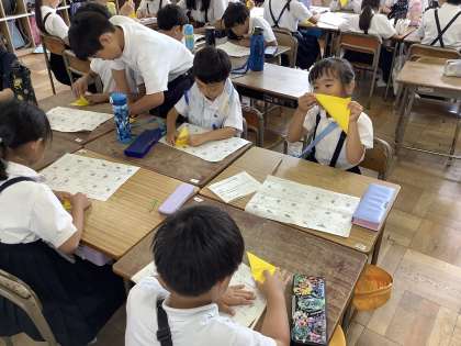 全員で集まった後は、『伸ちゃんのさんりんしゃ』を子どもたちの声で読み聞かせがありました。その後、平和への願いをこめてみんなで『おり鶴』をおりました。一人ひとりが心をこめて折った『おり鶴』は、重なり合うことで『おり鶴パネル』となり、6年生が修学旅行で広島県に連れていってくれます。