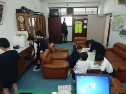 校長室では、テーブルなど、長いものを探して測っていました。