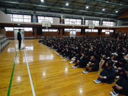 次に、生活指導の先生より、「みなさんに頑張ってほしい事は2つです。一つは、『春休みのくらし』に書いてある事を守って元気よく過ごすこと、もう一つは、始業式の日に、集団登校で一年生を加えて、きちんと登校する事です。」というお話がありました。