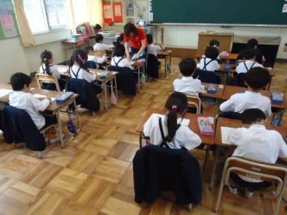 教室をのぞいてみると、大きな声で国語の教科書を読んだり、真剣な表情でひらがなの練習をしたり、算数のブロックを初めて使ったりと、一生懸命学習する様子が見られました。