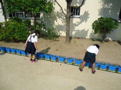 登校して、学習の準備をした後に、運動場に並んだ自分鉢に水をやりにいきます。