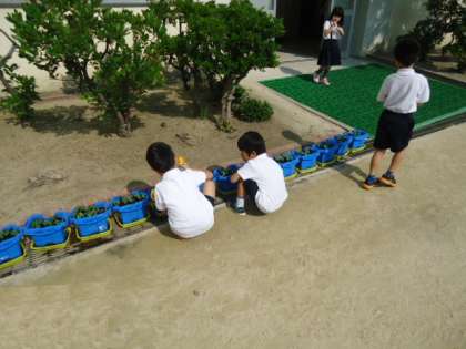 1年生の朝の日課は、アサガオへの水やりです。