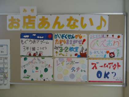 2年生以上はゲームのお店を出すのですが、どんなお店をするのかが決まって、玄関ロビーにポスターが張り出されました。