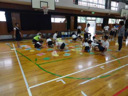 指定された手足で、指定された色のパネルをタッチします。姿勢がとれなくなるとアウトです。体力の限界に挑戦です。