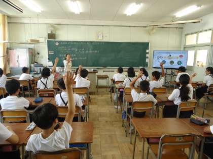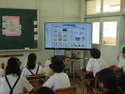 みんなは、大型モニターに映し出されたデジタル教科書の映像を見ながら、病原体の発生源や、感染する道筋、身体の抵抗力など視点を明確にしながら、どうすれば予防できるかを考えました。
