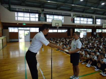 ※始業式前に、校外の空手大会で優秀な成績をおさめた児童を表彰しました。