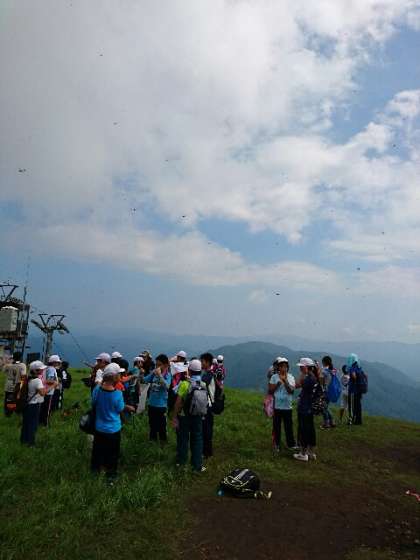 山頂には、大勢の子どもたちに混じって、無数のトンボが乱れ飛んでいます。