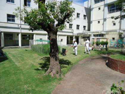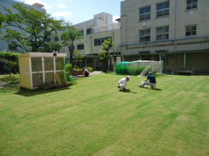 高殿小学校の中庭の芝生は、学校だけが管理するのではなく、地域やPTAの皆さんを中心とした「芝生化実行委員会」中心になって管理しています。