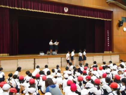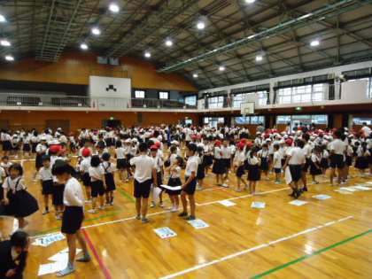 運動場で準備をしていたら急に激しい雨が降ってきて、急遽講堂での実施になりました。