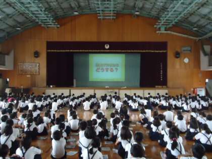 防災学習2時間目は、講堂でたてわり班での活動をしました。