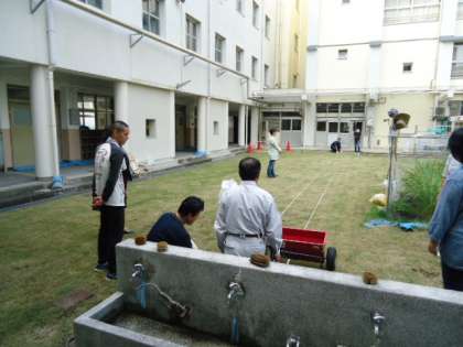 また、作業は、旭区役所の職員の方や、旭陽中学校の芝生化実行委員会の皆さんも一緒にしてくださっています。