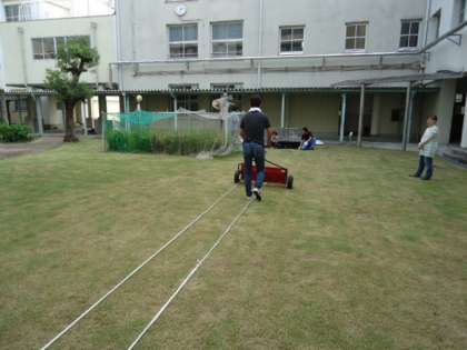 高殿小学校の中庭の芝生は、地域や保護者の皆さんが中心となった芝生化実行委員会が維持管理しています。