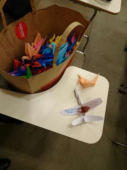 お話が終わった後、羽ばたく折り鶴など平和への願いを込めたプレゼントも頂きました。