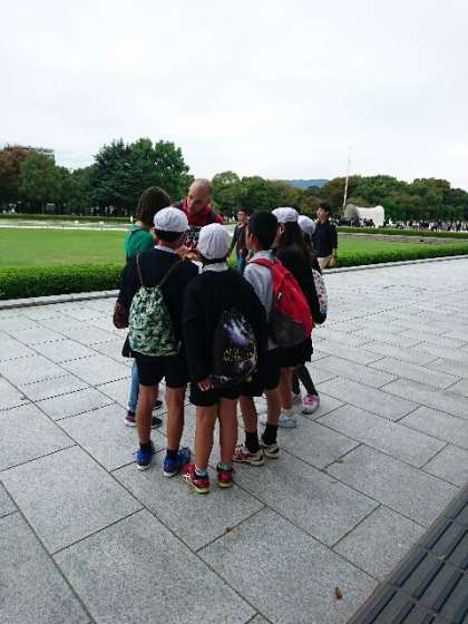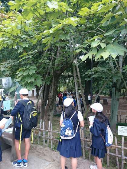 グループごとで、今年の5月にオバマ大統領が演説した原爆慰霊碑や被爆アオギリなどをめぐり、公園内を散策しました。