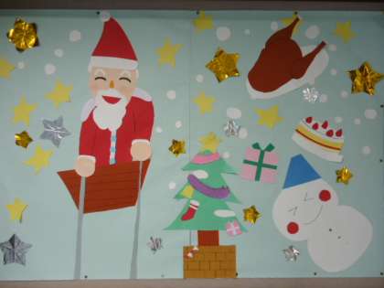 掲示委員会が作ってくれた玄関掲示もクリスマス仕様にかわって、朝から登校してきた児童が見入っていました。