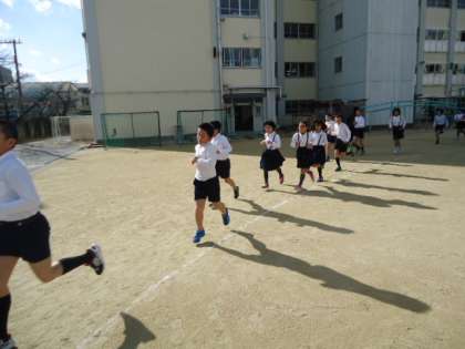 身を切るような冷たい風の中を、今日は奇数学年がかけ足運動をしました。