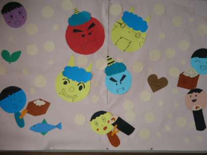 学校の玄関掲示は、掲示委員会の子どもたちが節分バージョンを作ってくれました。