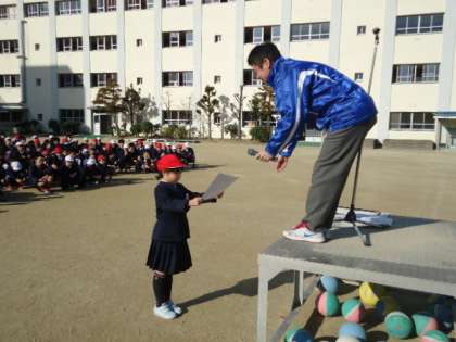 ※今日の全校朝会では、先日の旭区子ども文化祭で優秀賞をいただいた、太鼓クラブ「絆」の表彰を行いました。