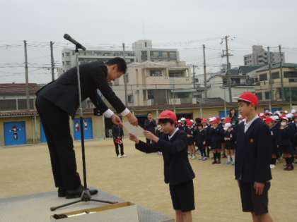 ※今朝の朝会では、区のミニバスケットボール大会で優勝した児童たちの表彰を行いました。