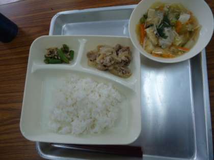 メニューは豚肉のしょうが焼き、ツナと三度豆のいためもの、すまし汁です。