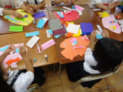 お家の方にもアドバイスしていただきながら、いろいろな丸め方を使って、カラフルな魚をデザインしました。