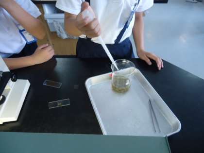 池の水を採取して、顕微鏡をセットしたら、プレパラートを作ります。