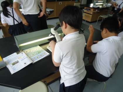 顕微鏡の使い方を学習した5年生が、中庭の池の水にいる微生物を調べました。