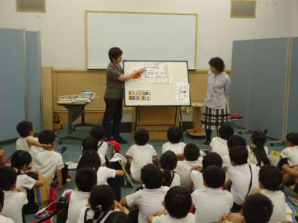 そして、旭図書館では、館長さんと職員の方に、パネルシアターで、図書館のしくみや使い方を教えていただきました。