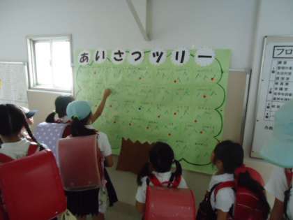 あいさつがきちんとできたら集団登校班ごとに「あいさつツリー」に実のシールを貼ります。