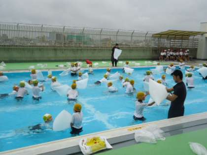 2年生はごみ袋などを使って、浮く練習もたくさんしました。