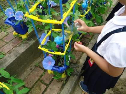 1年生のみんなは、朝学校に来たら、いくつ咲いているかを数えながら水やりしています。