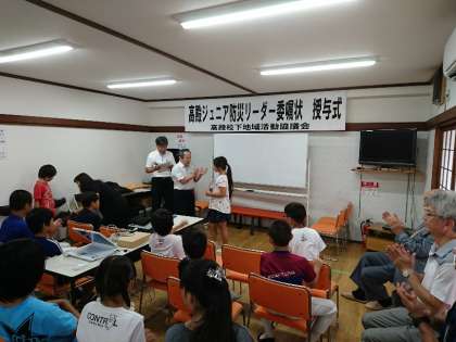 高殿校下地域活動協議会が主催するジュニア防災リーダーの委嘱状授与式が、高殿会館で行われました。