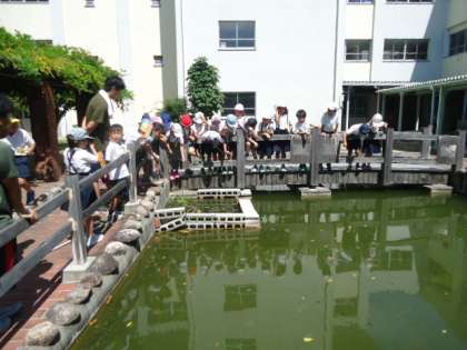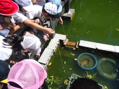 今日は、中庭の池に住みつくザリガニを、スルメを餌に釣り上げにチャレンジしました。