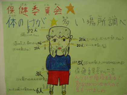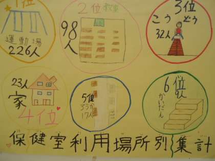 1学期最後の保健委員会では、1学期間のからだのけがの多い場所調べと学校の場所別に分けてまとめました。