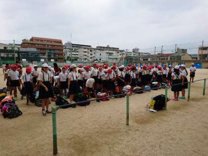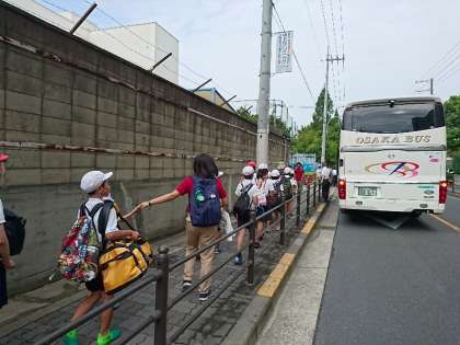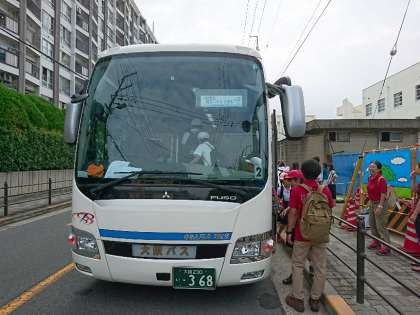 揃いのユニフォームを着た先生たちと出発式をして、バスに乗り込みました。