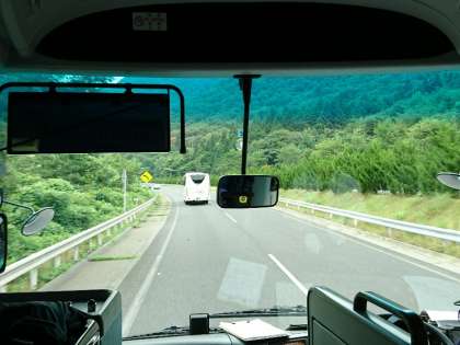 ちょっとバス酔いしている人もいますが、車中はゲームや歌で盛り上がっています。