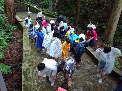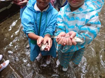そのために川が増水したので調整プールを使って魚つかみをしました。