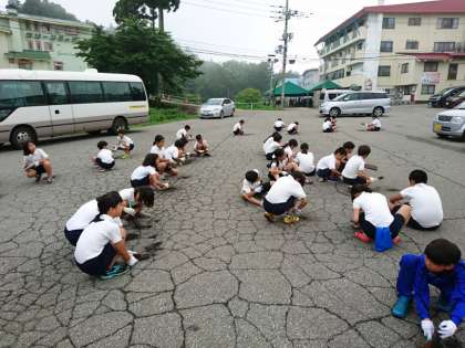 最初のすす落としでは、何人もが鼻の頭を真っ黒にしながら板を磨き上げました。