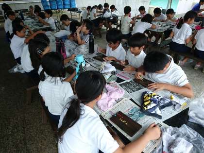 普通の絵の具と違って、チューブを直接絞って描くので結構難しいですが、みんな思い出を形にしようと一生懸命作りました。