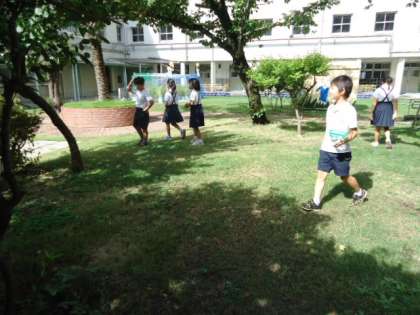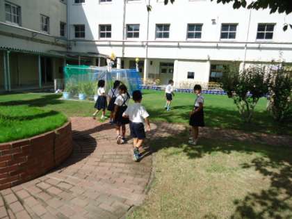 3年生が、絵を描くために中庭で虫さがしをしています。